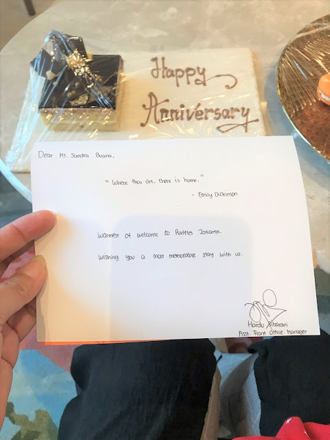 Ada surprise cake, ucapan selamat wedding anniversary, dekorasi lucu & paket aktivitas anak ketika kami masuk kamar. Seneng banget karena berasa diperhatikan & anak-anak juga senang karena ada cake yg super enak, dan peralatan main yang bisa digunakan sebelum berenang. Kemudian, datang sepoci teh hangat sebagai welcoming drink dan staff hotel juga mengucapkan selamat ulang tahun pernikahan, so nice (tapi bukan sosis hahaha) and sweet. Thank you Raffles Jakarta!